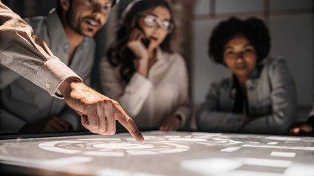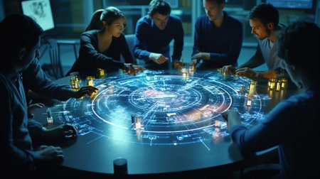A diverse group of professionals is gathered around a large interactive table, discussing and planning a cityscape project. They are using digital tools and physical models to visualize and strategize.
