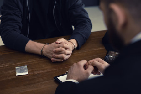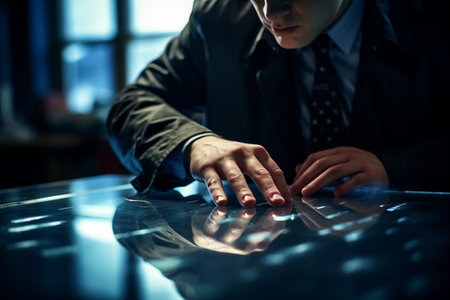 Detective analyzing fingerprints on glass surface. Closeup cropped shot of police chemist job in process. Generative AI