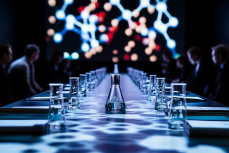 Engineer, Scientists and Developers Gathered Around Illuminated Conference Table in Technology Research Center,