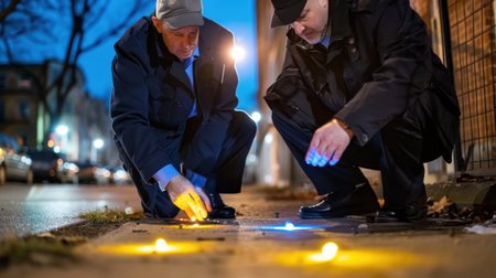 Two men in police attire examine a scene with colored lights on the pavement at night, reflecting teamwork and the investigation process in an urban setting.