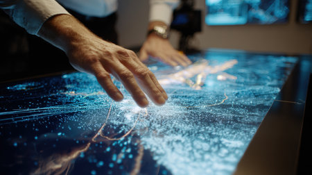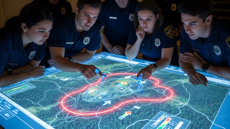 Five people in dark uniforms focus on a bright interactive map with highlighted areas and arrows.