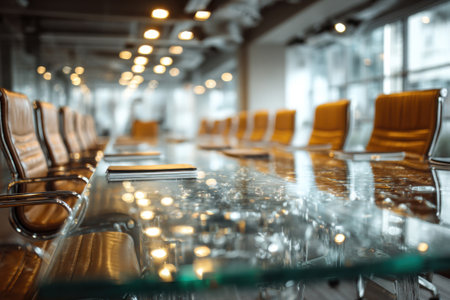 Executives in formal attire seated around a conference table, robot assistant in a business office setting concept
