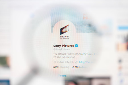 Odessa, Ukraine - December 1, 2020: Sony Pictures official twitter web page on screen through magnifying glass