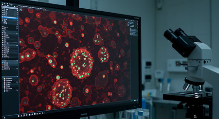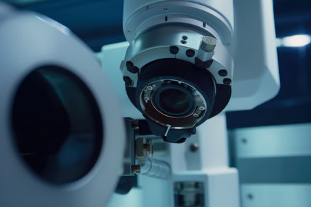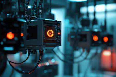 Advanced technology apparatuses with glowing elements are arranged in a contemporary lab environment.