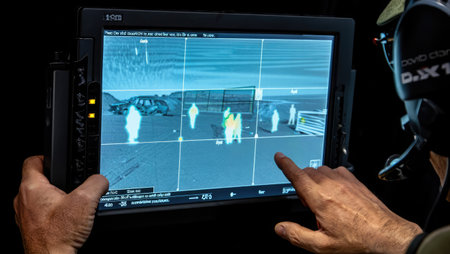 In a nighttime surveillance operation, an individual closely examines a thermal imaging screen revealing several figures in a dark urban area with a sense of urgency and focus.