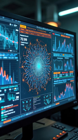 High-tech data visualization screen displaying complex cybersecurity analytics. That the image is generated using AI.