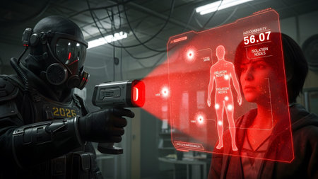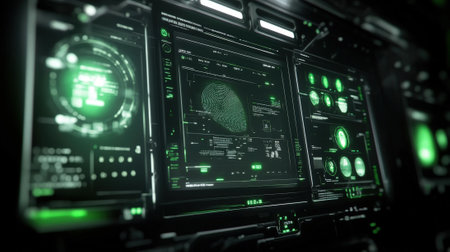 A futuristic AI-powered digital security system scanning a database for potential threats.