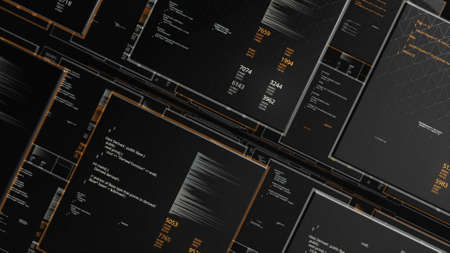 Flying through futuristic technological interface with big data analysis. Animation. Modern high tech program with artificial intelligence elements.