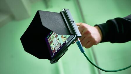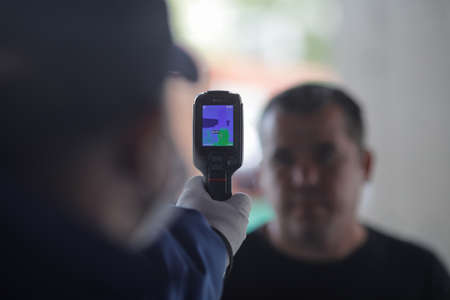 Close-up of a man hand-held holds a thermal imaging camera. Covid-19 temperature test without touching.