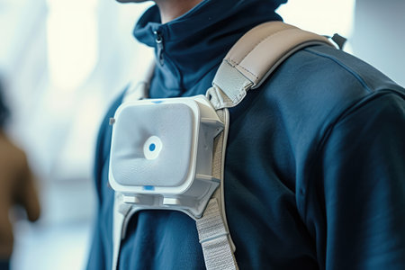 A man wearing a back brace has a camera attached to his shoulder, capturing moments from a unique perspective, Wearable lung monitoring device for asthma patients, AI Generated