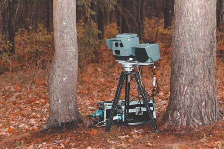 speed camera is standing in the forest. shallow depth of field. there is tinting.