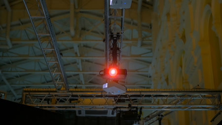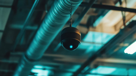 A sleek surveillance camera hangs from the ceiling, with a blue light indicating functionality. The industrial setting highlights modern security technology and its importance in urban safety.