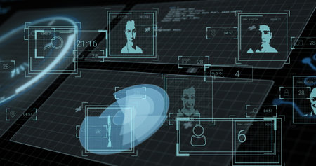 A captivating cinematic shot showcasing various faces on a digital interface, enhanced by a high-tech whip effect and a futuristic ambiance.