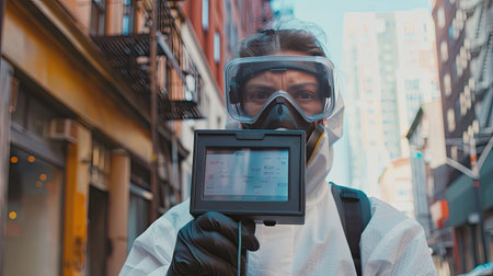 A handheld thermal thermometer scanning crowded public entrance for health screening, urgent preventive check with device