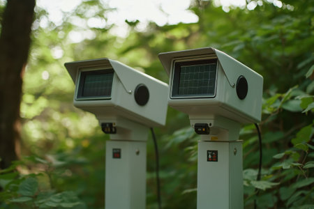 Two solar-powered surveillance cameras stood in a forest, monitoring wildlife activity during the day.