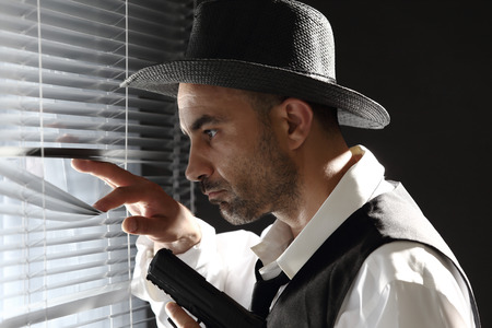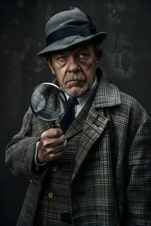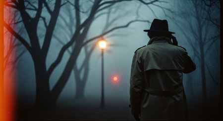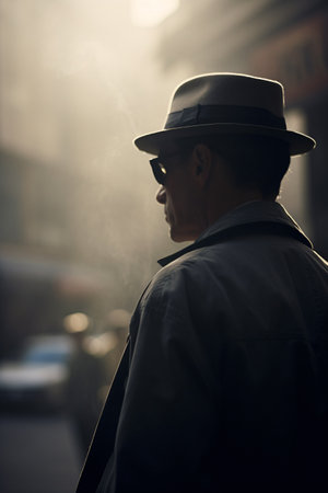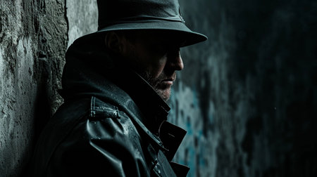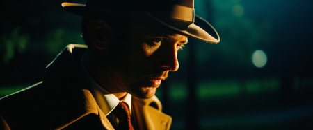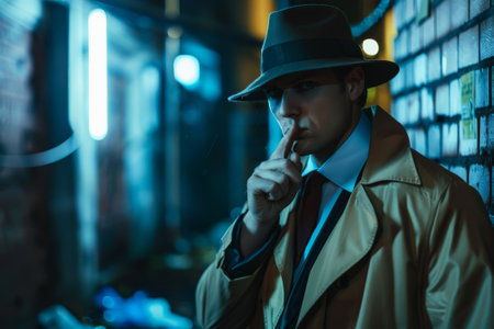 Mysterious detective in vintage hat and coat with dramatic lighting.