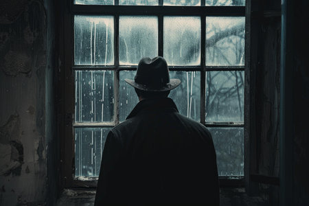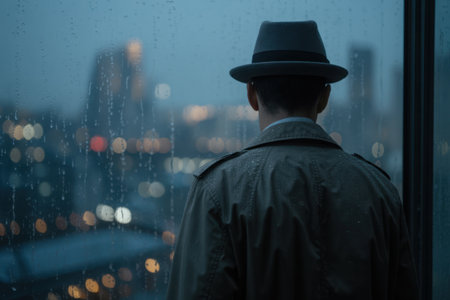A solitary figure wearing a fedora and trench coat looks out a window at a blurred, rainy city scene. Reflections in the glass add to the atmosphere of intrigue and mystery.