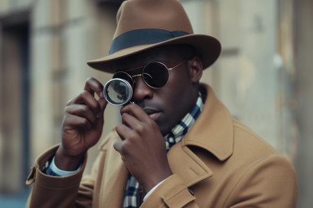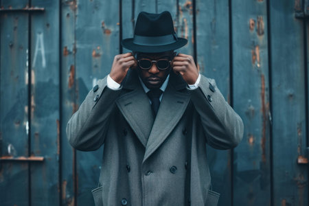 Observant Black man dressed detective. Mafia suit hat detective male portrait. Generate Ai
