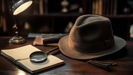 A vintage hat rests beside a magnifying glass and an open notebook on a wooden desk, illuminated by a warm lamp. This cozy library scene evokes exploration and creativity.