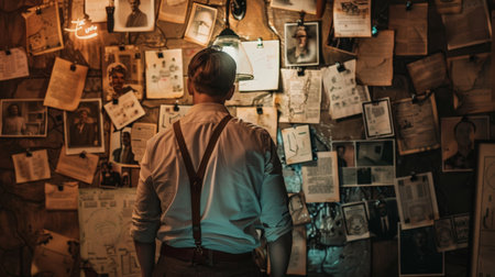 A police detective looking at a wall covered in photos and notes about a murder mystery