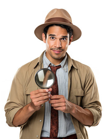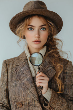 Woman in a brown coat and hat holding a magnifying glass, curious expression, white background