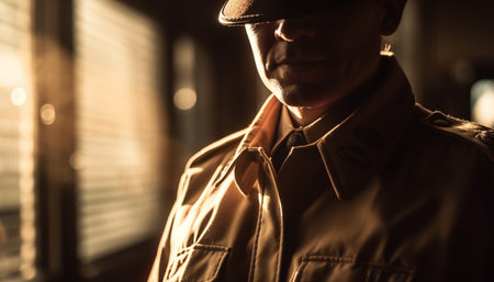 Mysterious detective in vintage hat illuminated by dramatic light.