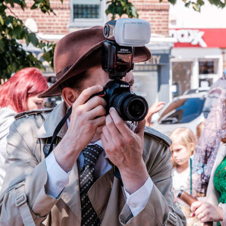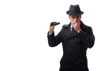 FlashHes got the shot. Private detective capturing a photo suspiciously from around a corner while using a retro camera.