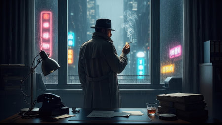 A silhouette of a detective smokes near a window, gazing at a city scene. The illustration uses dark tones, with details of a hat, coat, and a burning cigarette. The composition includes a notebook, magnifying glass, drink, and telephone. This image is ideal for editorial or commercial purposes.