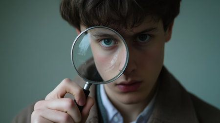 A young man holds a magnifying glass to his face, magnifying his eye, expression curious and analytical.