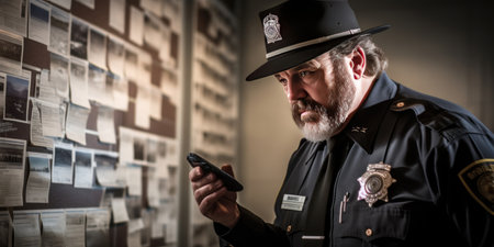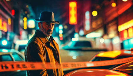 photo of portrait close up view of serious detective man is under investigation at the scene, generative AI