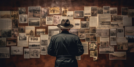 Focused detective studying photographs, immersed in solving a case in a dark setting. AI generative.