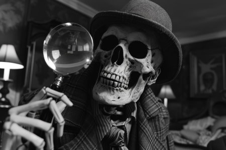 A skeleton wearing a hat and holding a magnifying glass. The skull is looking at the camera