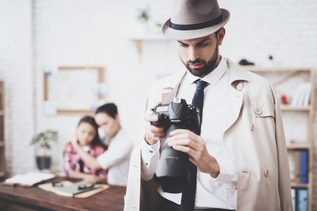 Private detective agency. Man in hat and cloak is posing with camera, woman is holding her daughter.