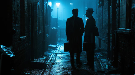 Silhouetted figures exchanging briefcases on a foggy, dimly lit street at night