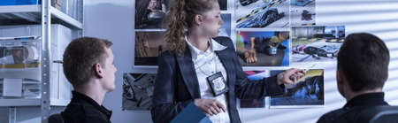 Two investigators review evidence and incriminating proof to find suspect, searching for his identity on surveillance photos. Forensic experts analyzing handwriting and fingerprints.
