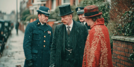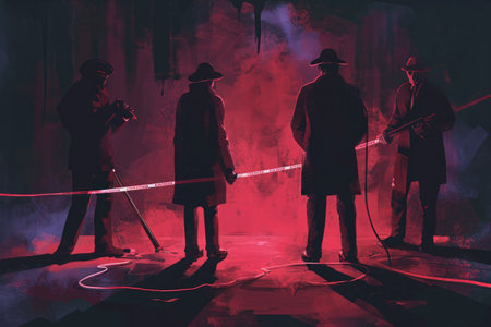 Diverse Group of Men Standing Together With Smiling Faces, Shadowy figures investigating a crime scene for a detective podcast cover art, AI Generated