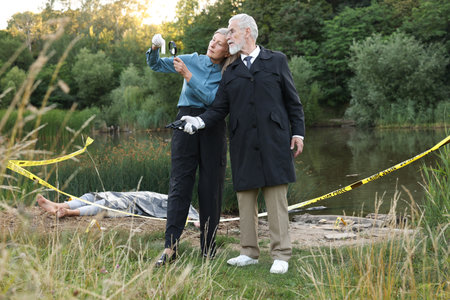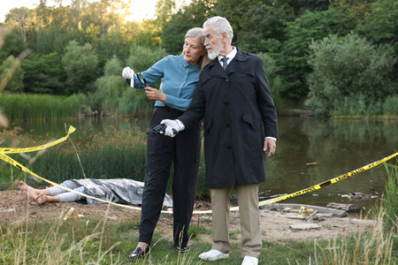 Forensic expertise. Detectives working at crime scene near lake outdoors