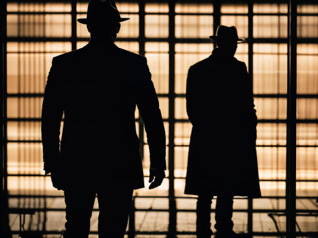 Mysterious detective in vintage hat illuminated by dramatic light.