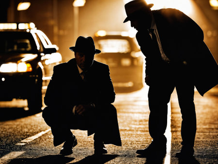 Two men in police attire examine a scene with colored lights on the pavement at night, reflecting teamwork and the investigation process in an urban setting.