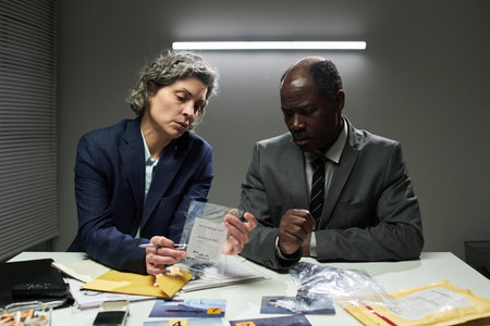 Two detectives examining evidence and discussing crucial aspects of investigation in brightly lit office setting, surrounded by yellow folders, envelopes, and evidence bags