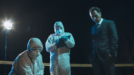 Detective and forensic scientists working hard at crime scene near headless body. Collection and photography of evidence, measurements, examination of the victim's body. Night scene.