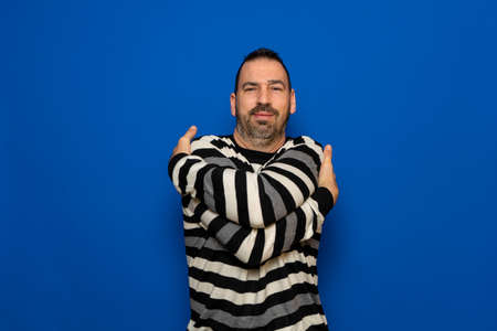You dont need a girlfriend if you can hug yourself. Selfish feeling concept. Funny latino with striped sweater hugging and smiling with pleasure.