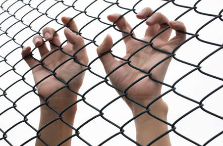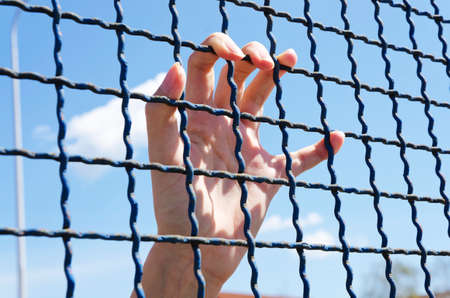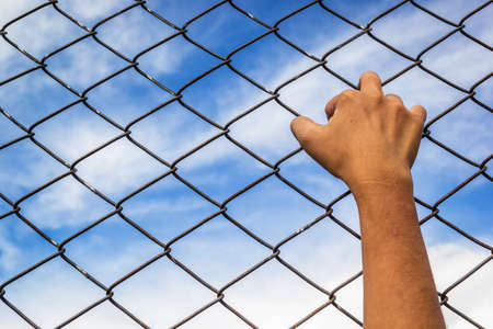 Young man hand holding on chain link fence for freedom, Human Rights Day, immigrant concept.