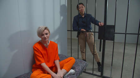 Asian warden and a female prisoner in a high-security prison stand in front of an open cell