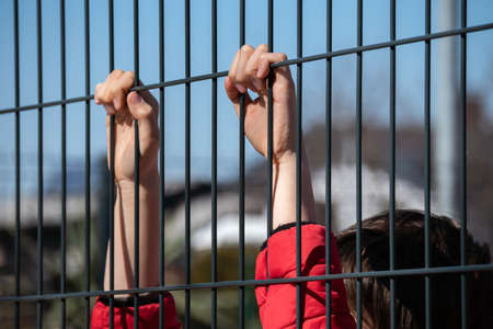 The child's hands are holding onto a metal mesh fence. Social problem of refugees and forced migrants.