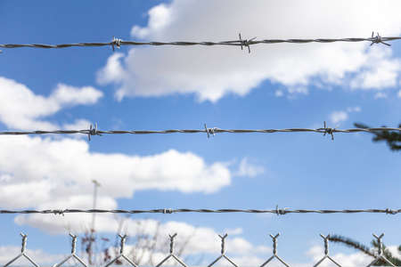 Barbed wire fence with cloudy sky background. Concept of freedom and security.