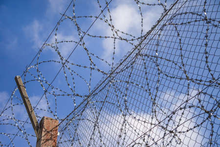 Prison security fence. Barbed wire security fence. Razor wire jail fence. Barrier border. Boundary security wall. Prison for arrest criminals or terrorists. Private area. Military zone concept.