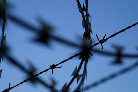 Close-up of a barbed wire fence against a clear blue sky. High quality photo
