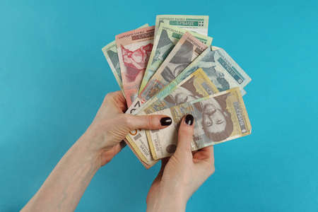 An unrecognizable person holding banknotes of different counties including Israeli Shekel -, finance