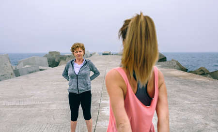 Young woman stretching with senior woman by sea pier